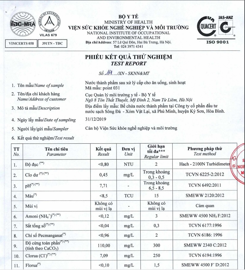 Công khai kết quả xét nghiệm mẫu nước của Công ty Cổ phần đầu tư nước sạch Sông Đà tháng 12