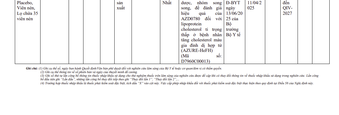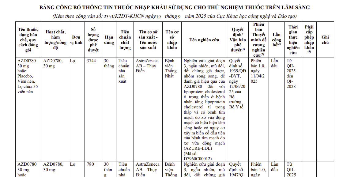 Thông tin thuốc nhập khẩu sử dụng cho thử nghiệm thuốc trên lâm sàng (AZD0780)