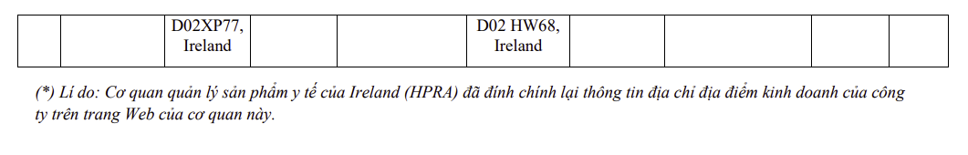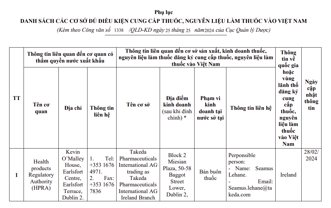 Danh sách các cơ sở đủ điều kiện cung cấp thuốc, nguyên liệu làm thuốc vào Việt Nam của Health products Regulatory Authority (HPRA)