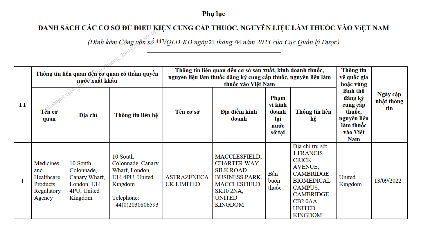 Danh sách cơ sở đủ điều kiện cung cấp thuốc, nguyên liệu làm thuốc vào Việt Nam - ASTRAZENECA UK LIMITED