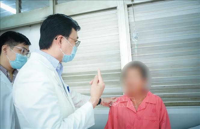 Bác sĩ Bệnh viện Chợ Rẫy kiểm tra thị lực bệnh nhân sau phẫu thuật. Ảnh: TTXVN phát