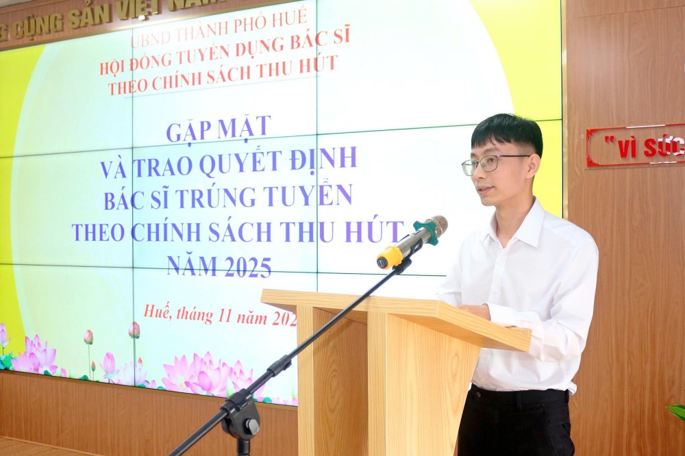 Thay mặt các bác sĩ trúng tuyển, đại diện bác sĩ trẻ đã bày tỏ lời cảm ơn đến Thành ủy, HĐND, UBND thành phố Huế và Sở Y tế vì đã tạo điều kiện để các bác sĩ được gia nhập đội ngũ viên chức ngành Y tế. Đồng thời cho biết đây là vinh dự lớn, đồng thời cũng là trách nhiệm đối với sự nghiệp chăm sóc sức khỏe nhân dân.
