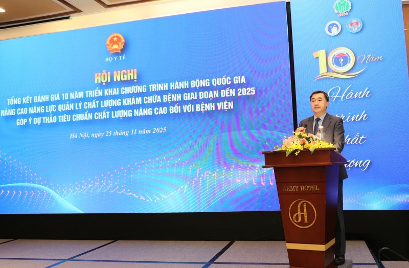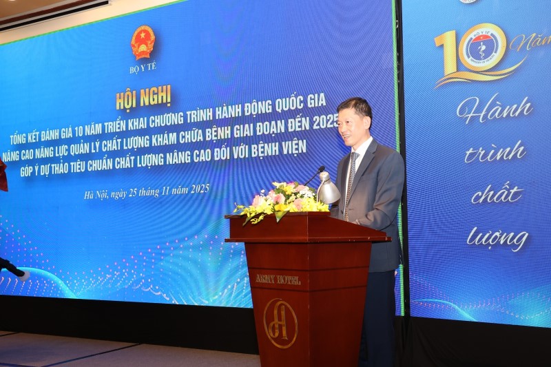 Ngày 25/11/2025, tại Hà Nội đã diễn ra Hội nghị Tổng kết đánh giá 10 năm triển khai Chương trình hành động Quốc gia nâng cao năng lực quản lý chất lượng khám chữa bệnh giai đoạn đến 2025 và Góp ý dự thảo Tiêu chuẩn chất lượng nâng cao đối với bệnh viện do Cục Quản lý khám chữa bệnh, Bộ Y tế tổ chức.