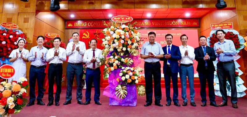 Thứ trưởng Bộ Y tế Đỗ Xuân Tuyên và đoàn công tác tặng hoa chúc mừng đồng chí Đoàn Nguyên Hồng
