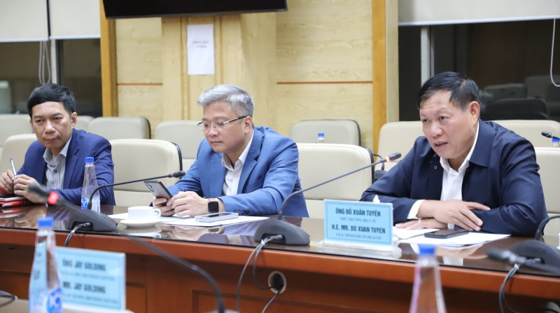 Thứ trưởng Bộ Y tế Đỗ Xuân Tuyên trao đổi chi tiết với đoàn công tác về công nghệ mới trong y tế