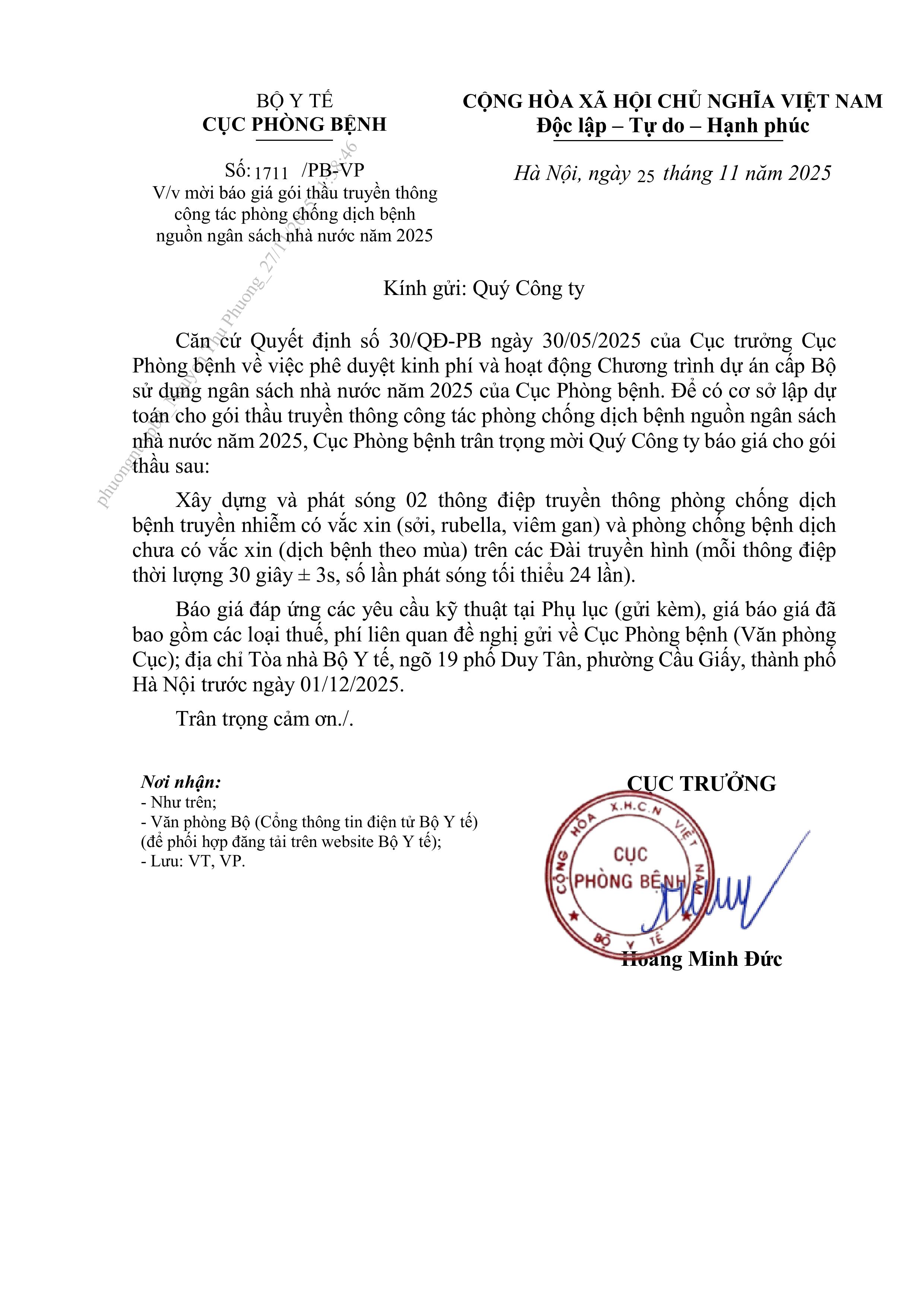 Cục Phòng bệnh mời báo giá gói thầu truyền thông công tác phòng chống dịch bệnh nguồn ngân sách nhà nước năm 2025