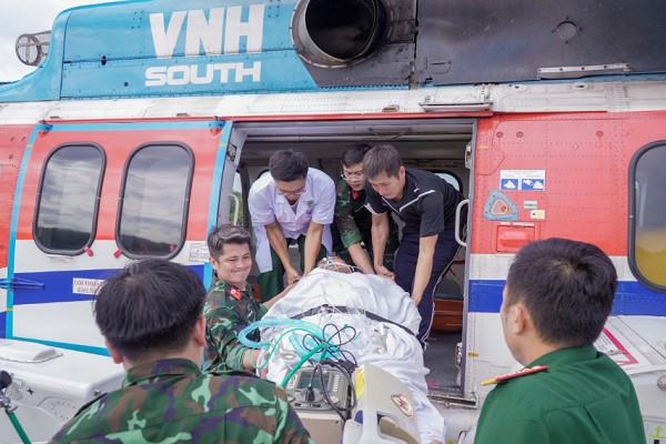 Chuyến bay đã hạ cánh an toàn tại sân đỗ trực thăng tòa nhà Viện Chấn thương chỉnh hình, Bệnh viện Quân y 175 lúc 10 giờ 30 ngày 6.9. Bệnh nhân được chuyển thẳng đến Khoa Cấp cứu để thực hiện các xét nghiệm chuyên sâu, cũng như hội chẩn nhằm đưa ra chẩn đoán chính xác nhất, và tiếp tục được điều trị, chăm sóc tích cực”, bác sĩ Chung thông tin.