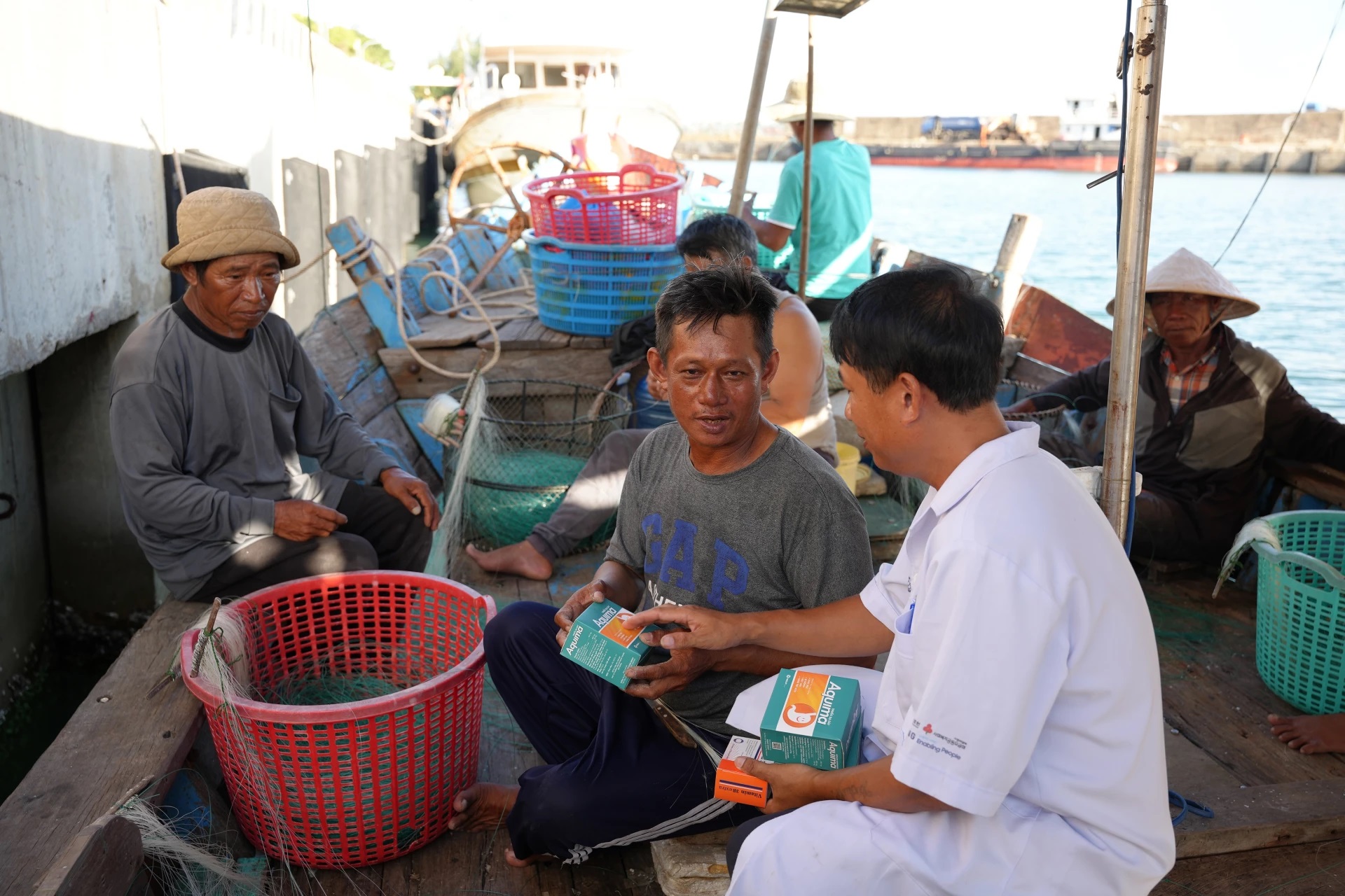 Cán bộ Trung tâm Y tế Quân-dân y đặc khu Cồn Cỏ cấp phát thuốc, tư vấn sức khỏe cho ngư dân - Ảnh: L.D
