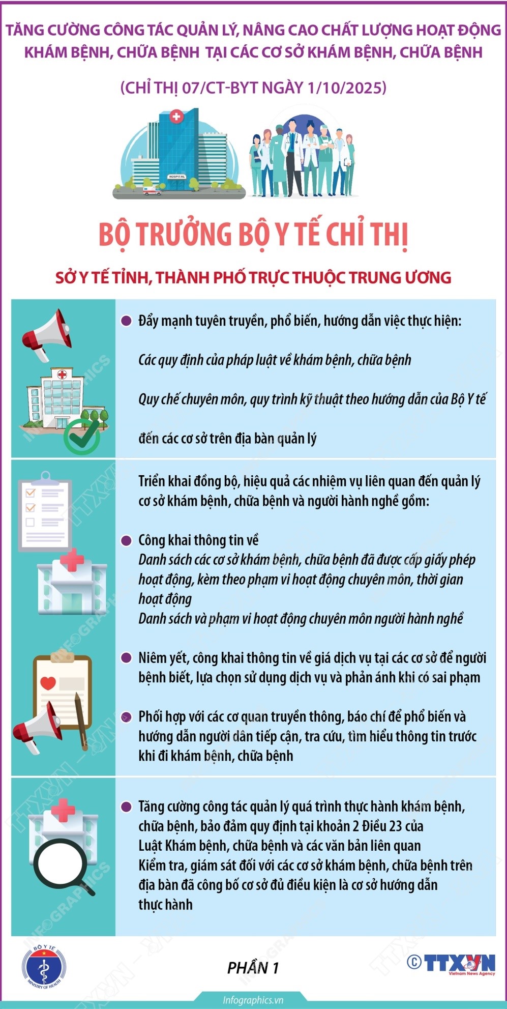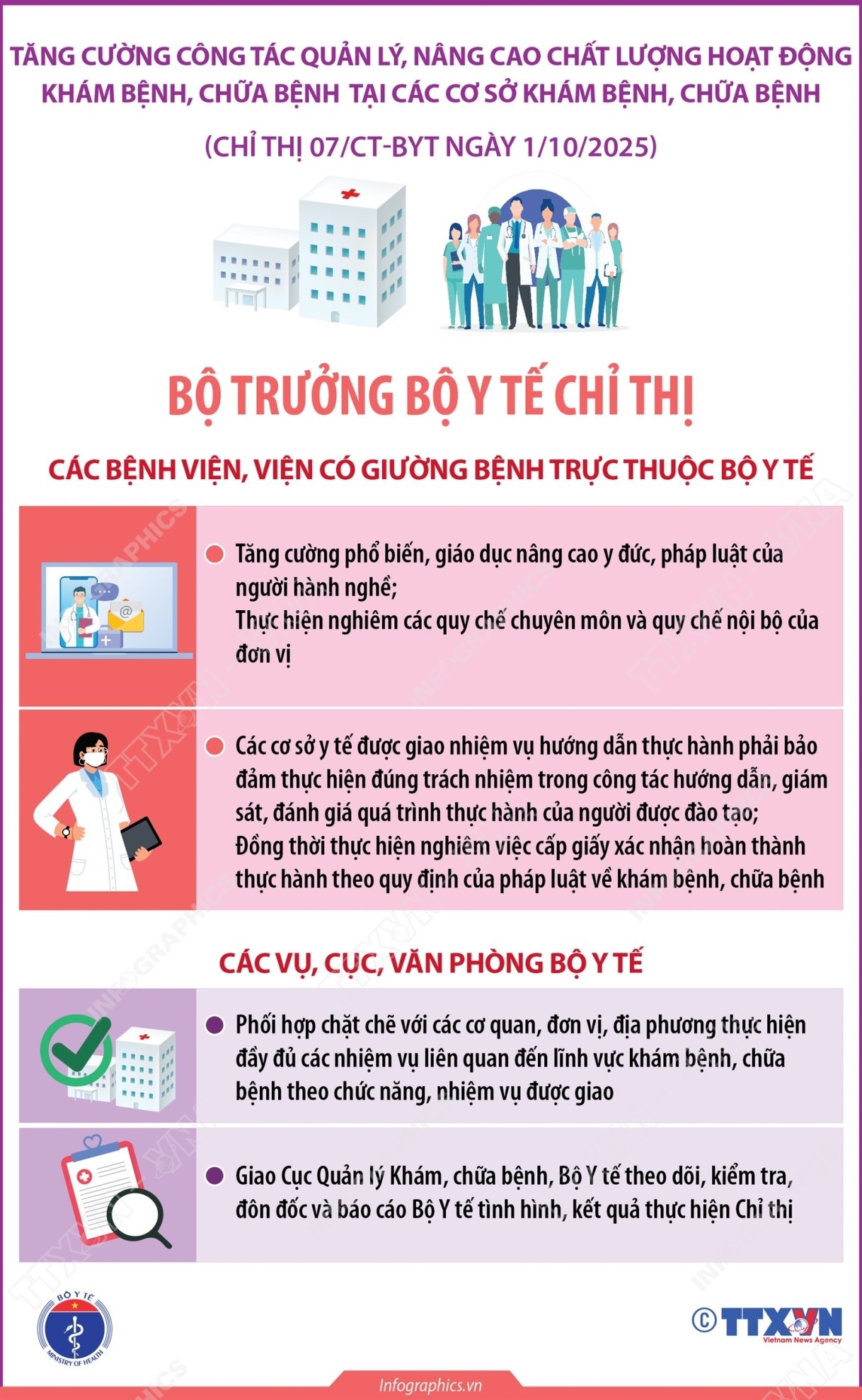 Bộ trưởng Bộ Y tế vừa ban hành Chỉ thị số 07/CT-BYT ngày 1/10/2025, một văn bản chỉ đạo quan trọng nhằm tăng cường công tác quản lý và nâng cao chất lượng hoạt động khám bệnh, chữa bệnh tại tất cả các cơ sở y tế.