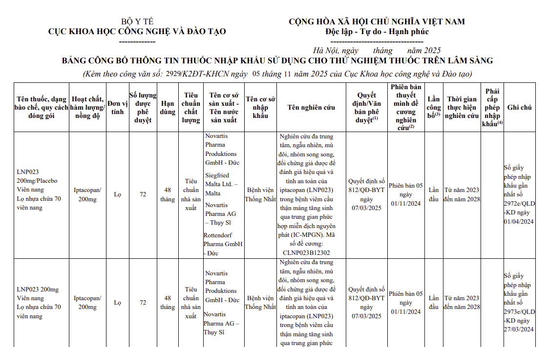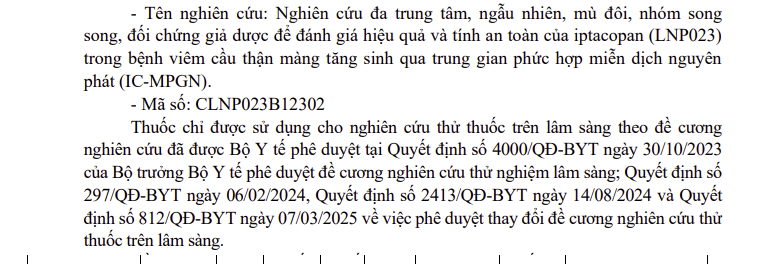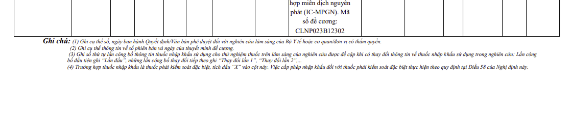Thông tin các thuốc nhập khẩu sử dụng cho thử nghiệm thuốc trên lâm sàng (Mã số: CLNP023B12302)