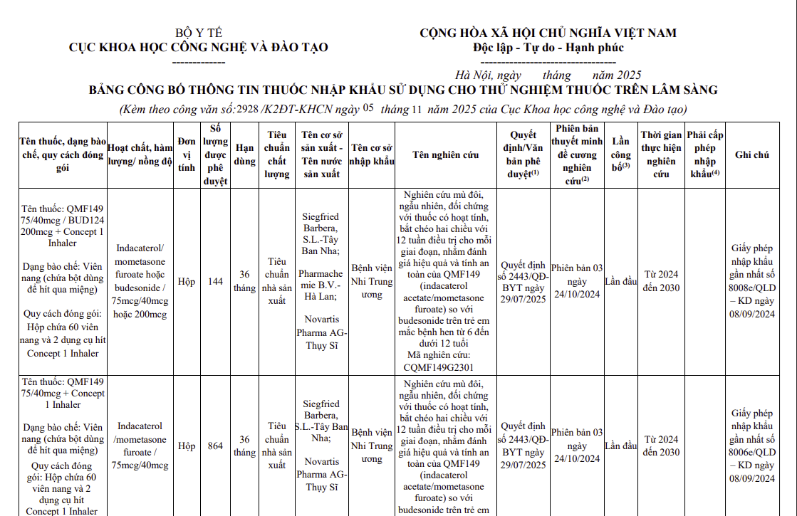 - Thông tin các thuốc nhập khẩu sử dụng cho thử nghiệm thuốc trên lâm sàng (Mã số: 71DX)