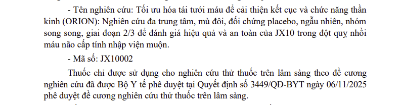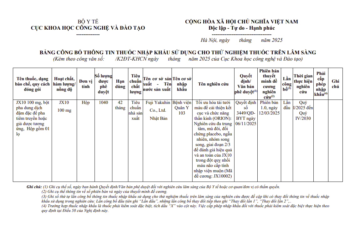 Thông tin các thuốc nhập khẩu sử dụng cho thử nghiệm thuốc trên lâm sàng (Mã số: JX10002)