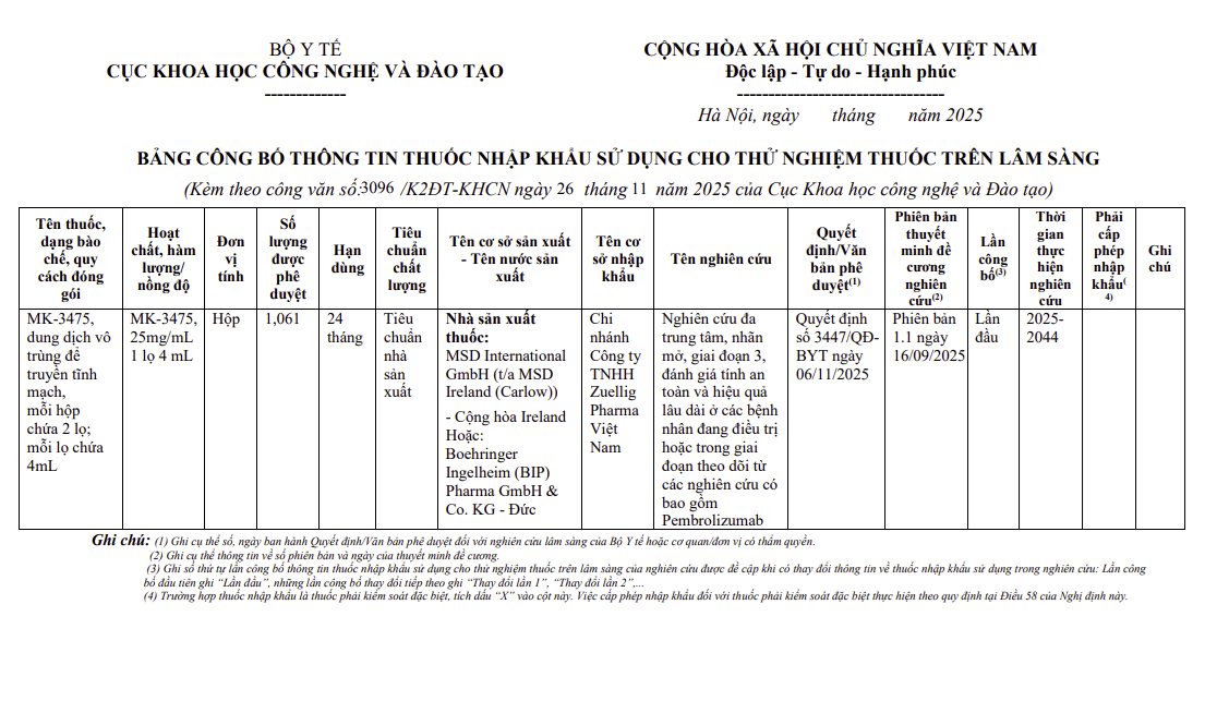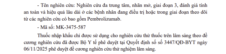 Thông tin các thuốc nhập khẩu sử dụng cho thử nghiệm thuốc trên lâm sàng (Mã số: MK-3475-587)