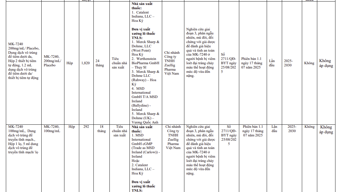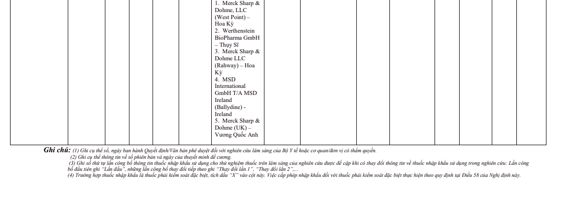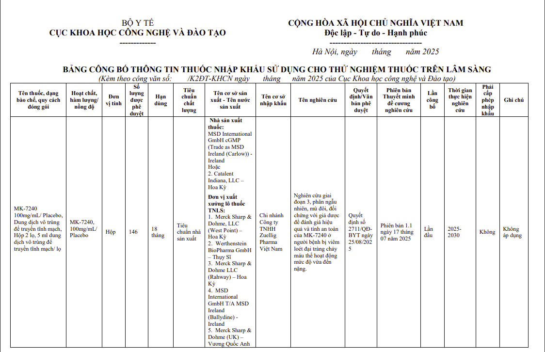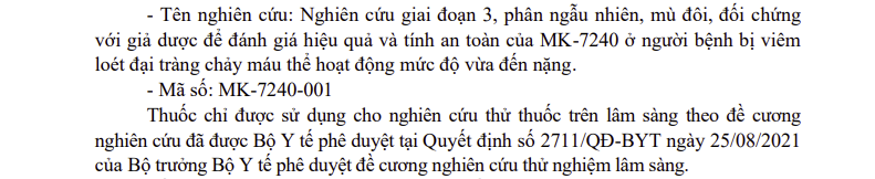 Thông tin các thuốc nhập khẩu sử dụng cho thử nghiệm thuốc trên lâm sàng (Mã số: MK-7240-001)