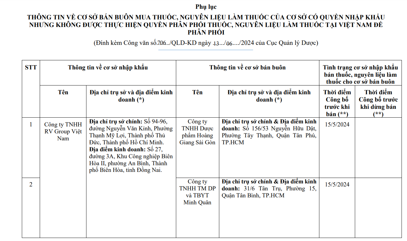 Thông tin về cơ sở bán buôn của cơ sở nhập khẩu nhưng không có quyền phân phối thuốc, nguyên liệu làm thuốc tại Việt Nam để phân phối của Công ty TNHH RV Group Việt Nam