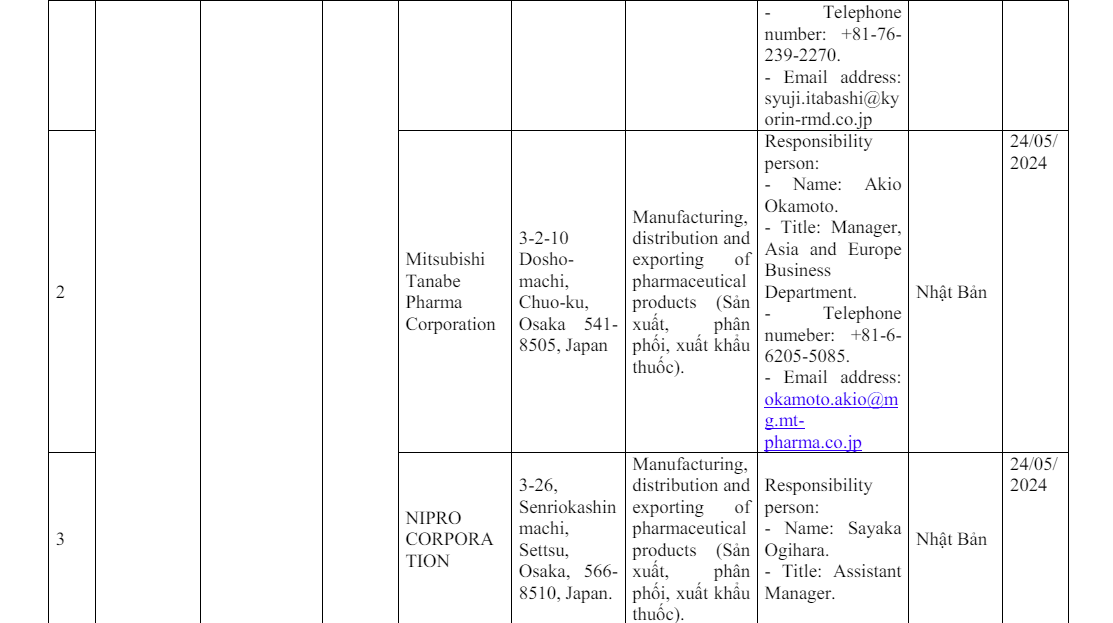 Thông tin về cơ sở bán buôn của cơ sở nhập khẩu nhưng không có quyền phân phối thuốc, nguyên liệu làm thuốc tại Việt Nam để phân phối của Ministry of Health, Labour and Welfare government of Japan