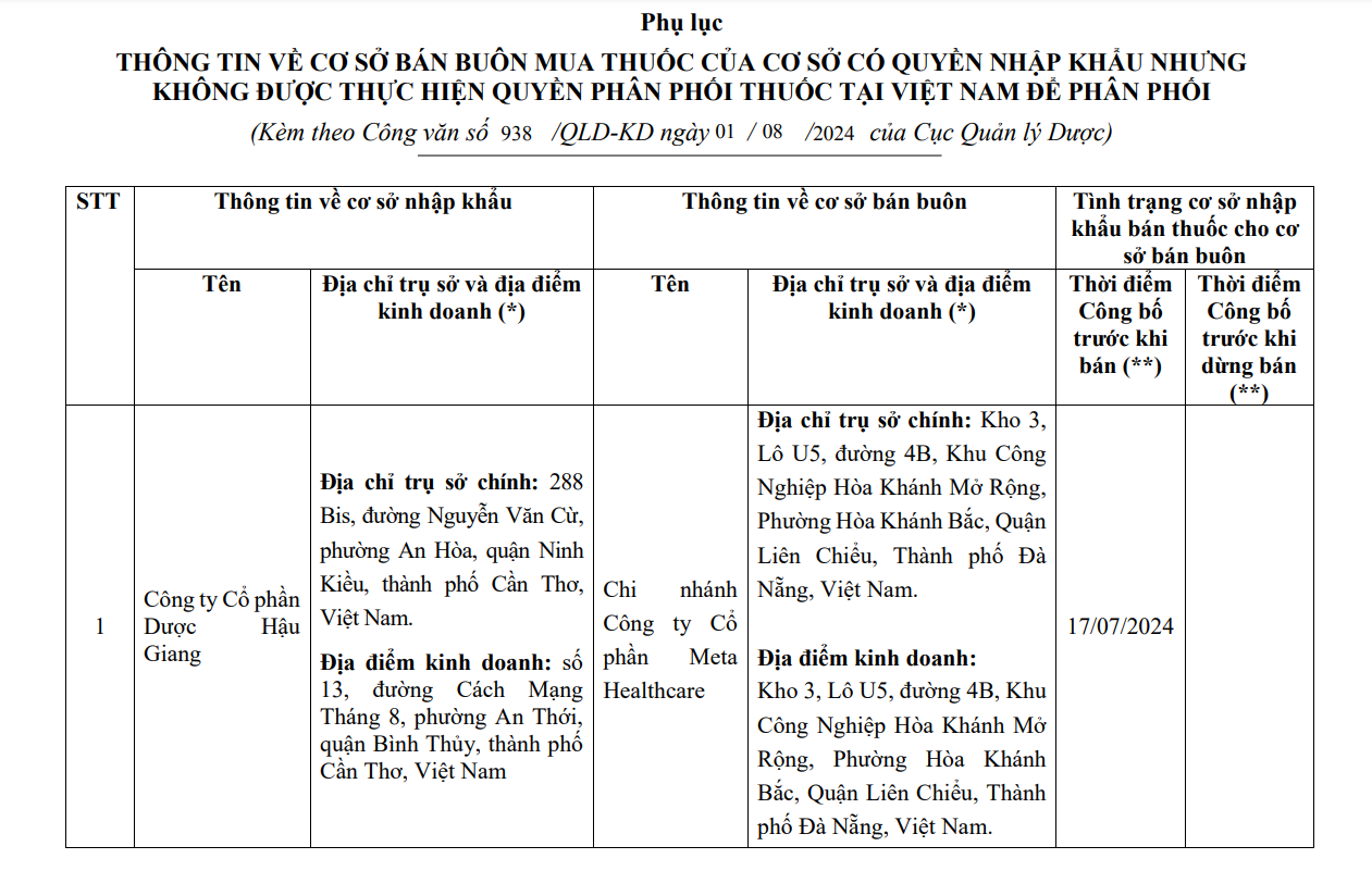 Thông tin về cơ sở bán buôn mua thuốc của cơ sở có quyền nhập khẩu nhưng không được thực hiện quyền phân phối thuốc, nguyên liệu làm thuốc tại Việt Nam của Công ty Cổ phần Dược Hậu Giang