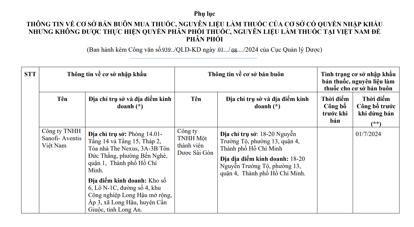 Thông tin về cơ sở bán buôn mua thuốc của cơ sở có quyền nhập khẩu nhưng không được thực hiện quyền phân phối thuốc, nguyên liệu làm thuốc tại Việt Nam của Công ty TNHH Sanofi- Aventis Việt Nam