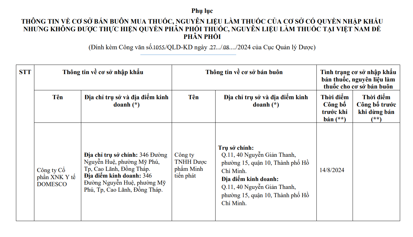 Thông tin về cơ sở bán buôn mua thuốc của cơ sở có quyền nhập khẩu nhưng không được thực hiện quyền phân phối thuốc, nguyên liệu làm thuốc tại Việt Nam của Công ty CP XNK Y tế Domesco