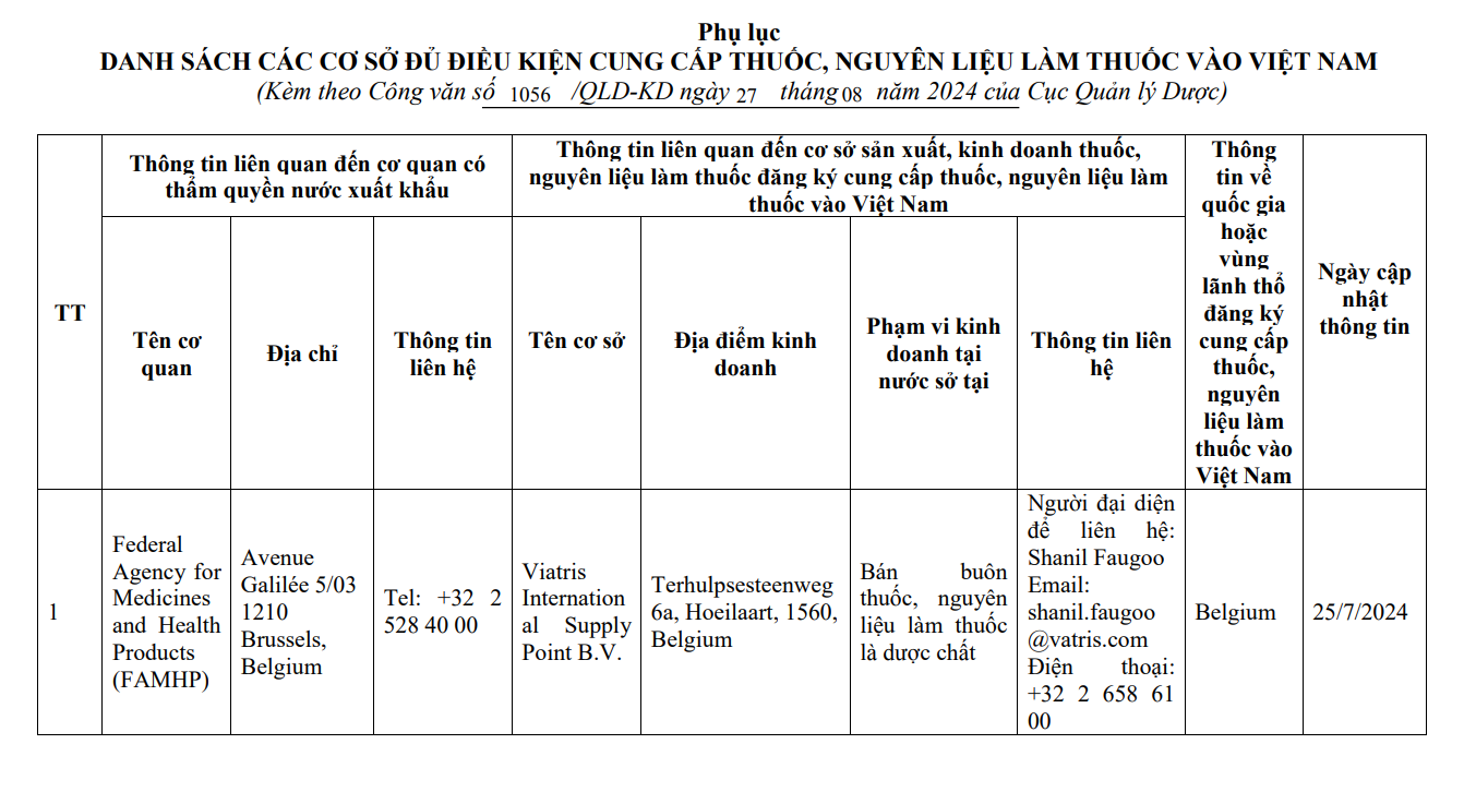 Danh sách các cơ sở sản xuất, kinh doanh thuốc, nguyên liệu làm thuốc nước ngoài đăng ký cung cấp thuốc, nguyên liệu làm thuốc vào Việt Nam của Federal Agency for Medicines and Health Products (FAMHP)