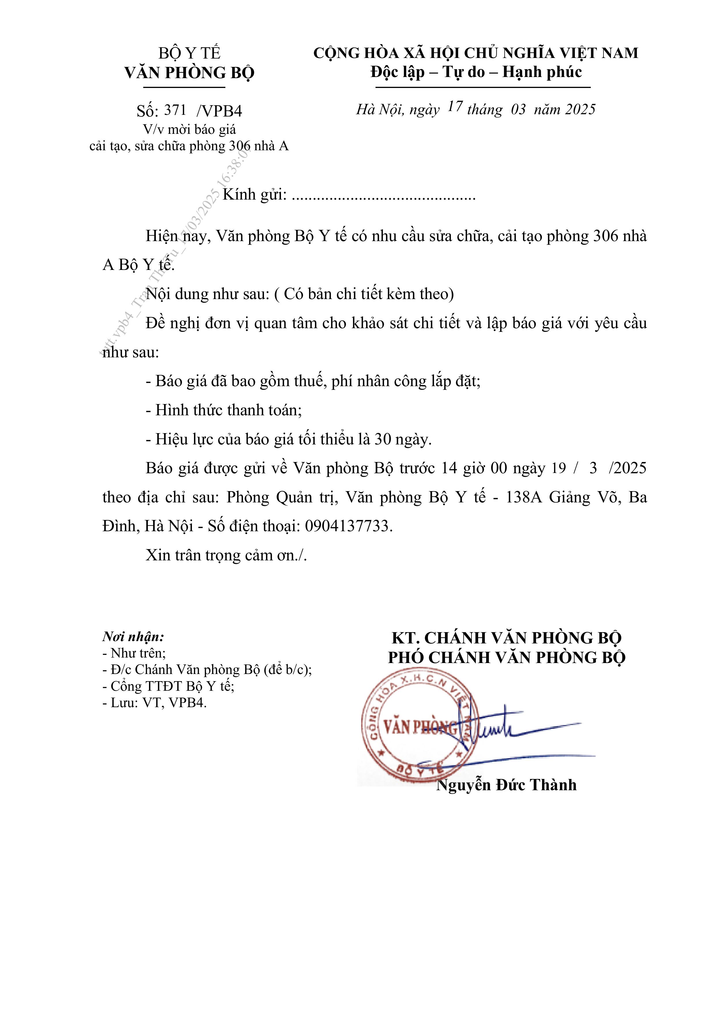 Hiện nay, Văn phòng Bộ Y tế có nhu cầu sửa chữa, cải tạo phòng 306 nhà A Bộ Y tế.