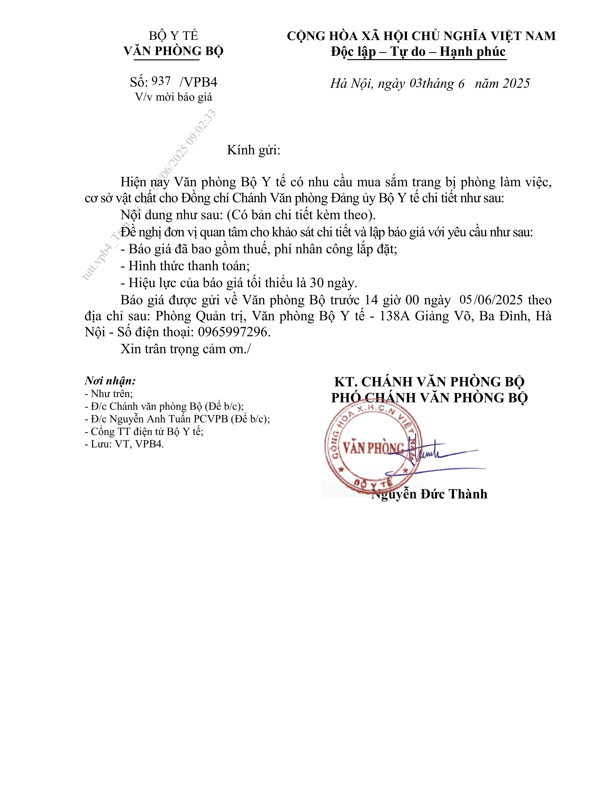 - Văn phòng Bộ thông báo mời báo giá dịch vụ khám sức khỏe định kỳ cho cán bộ công chức, viên chức, người lao động cơ quan Bộ Y tế