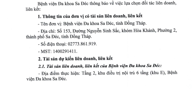 Thông báo công khai về việc lựa chọn đối tác cho Đề án sử dụng tài sản công vào mục đích liên doanh, liên kết của Bệnh viện Đa khoa Sa Đéc, tỉnh Đồng Tháp