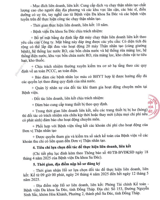 - Thông báo kết quả lựa chọn đối tác liên doanh, liên kết chạy thận nhân tạo tại Bệnh viện Đa khoa Sa Đéc, tỉnh Đồng Tháp