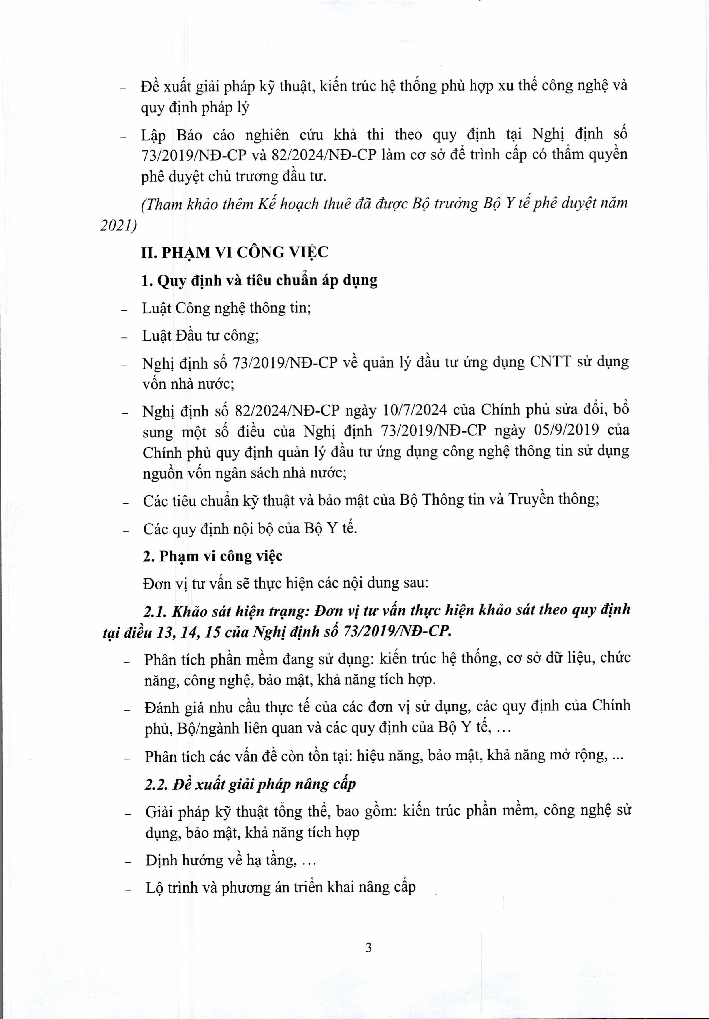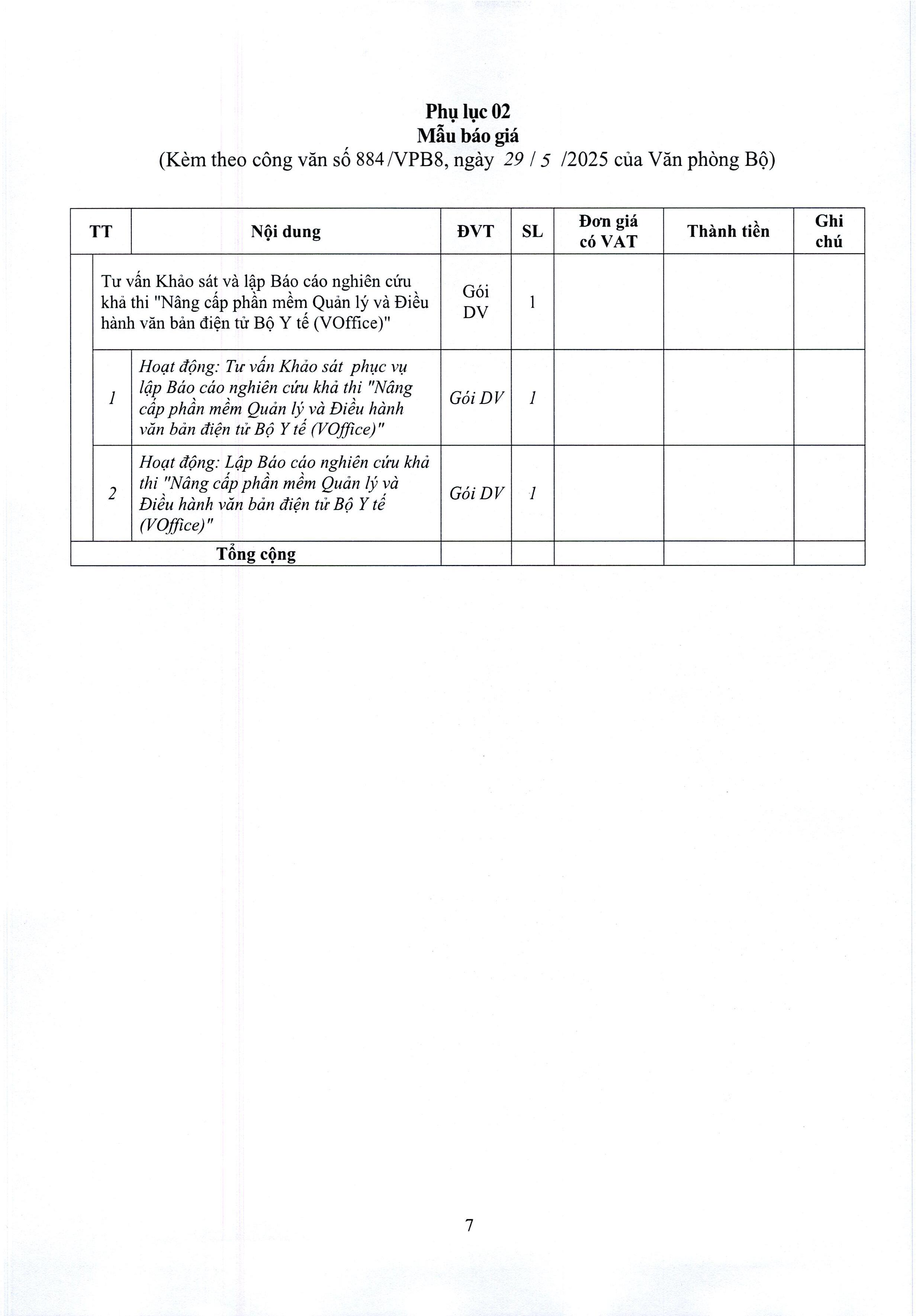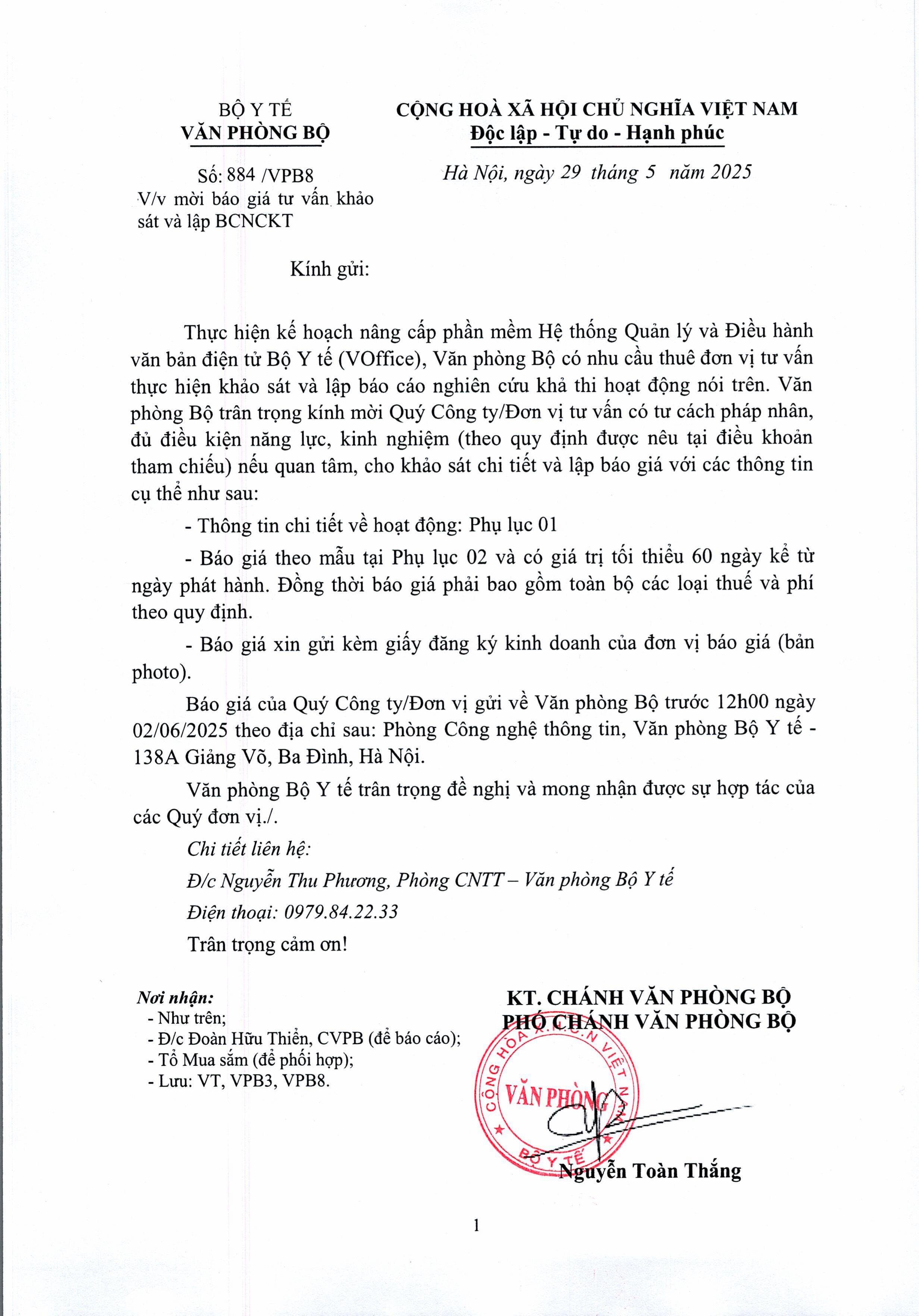 Thực hiện kế hoạch nâng cấp phần mềm Hệ thống Quản lý và Điều hành văn bản điện tử Bộ Y tế (VOffice), Văn phòng Bộ có nhu cầu thuê đơn vị tư vấn thực hiện khảo sát và lập báo cáo nghiên cứu khả thi hoạt động nói trên.