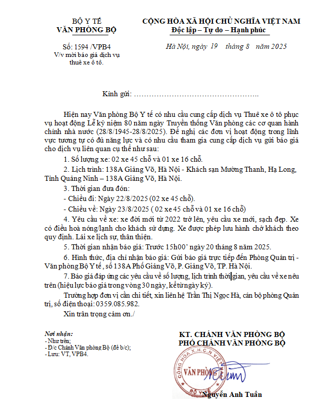 - Văn phòng Bộ Y tế mời báo giá dịch vụ thuê xe ô tô