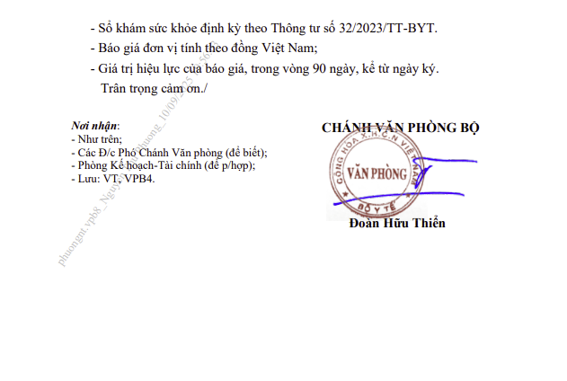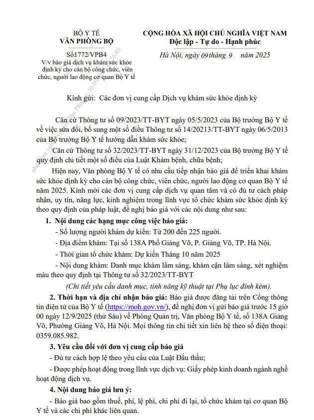 Văn phòng Bộ thông báo mời báo giá dịch vụ khám sức khỏe định kỳ cho cán bộ công chức, viên chức, người lao động cơ quan Bộ Y tế