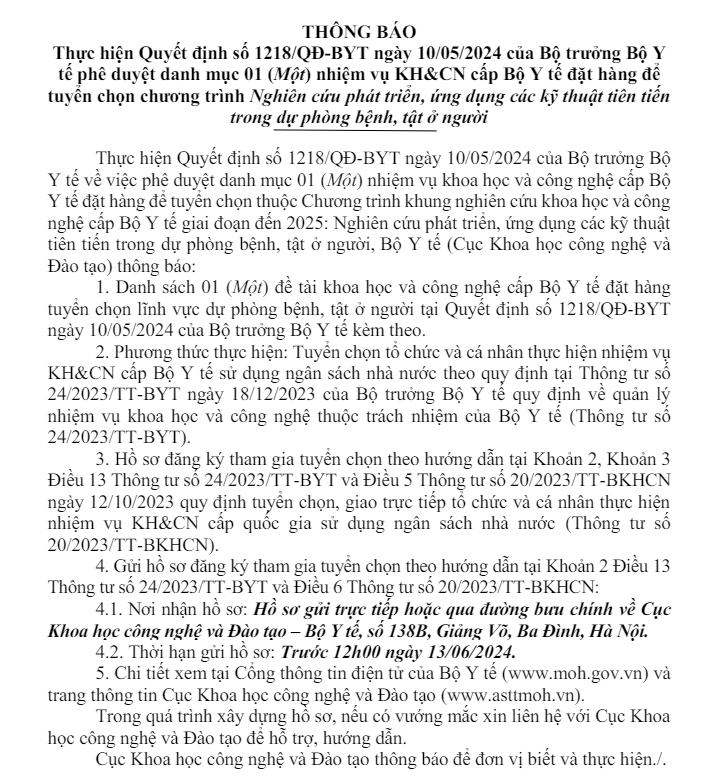 - Thông báo Tuyển chọn tổ chức, cá nhân chủ trì thực hiện đề tài KH&CN cấp Bộ Y tế