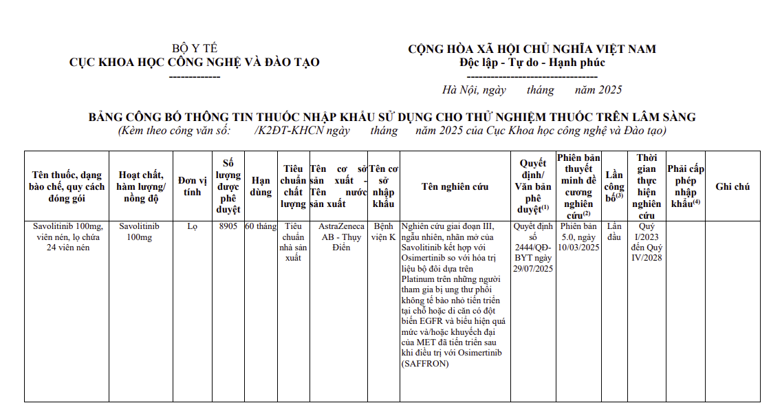 - Thông tin các thuốc nhập khẩu sử dụng cho thử nghiệm thuốc trên lâm sàng (Mã số: D8531C00002)