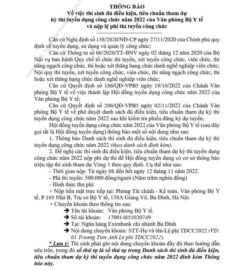 Thông báo thí sinh đủ điều kiện, tiêu chuẩn tham dự kỳ thi tuyển công chức năm 2022 của Văn phòng Bộ Y tế và nộp lệ phí thi tuyển công chức