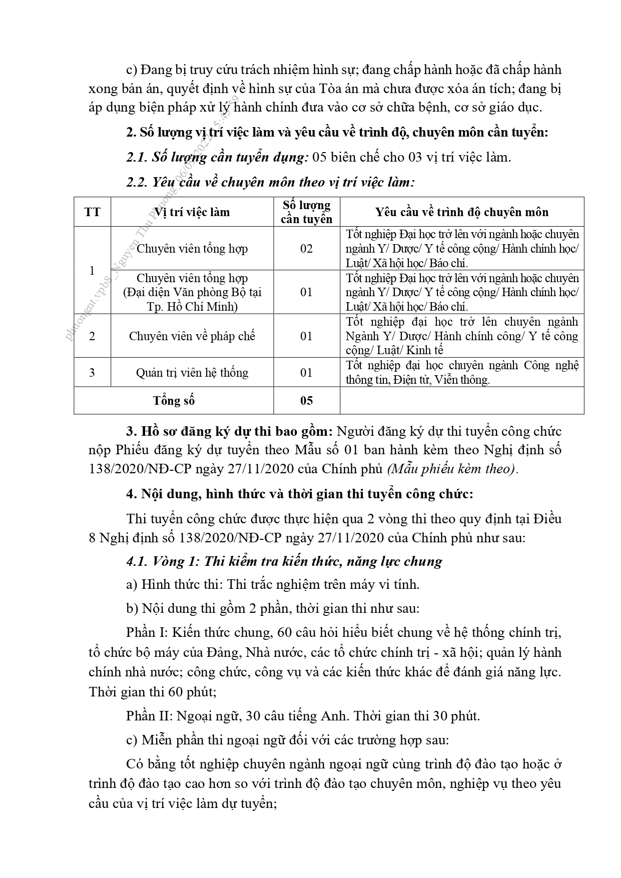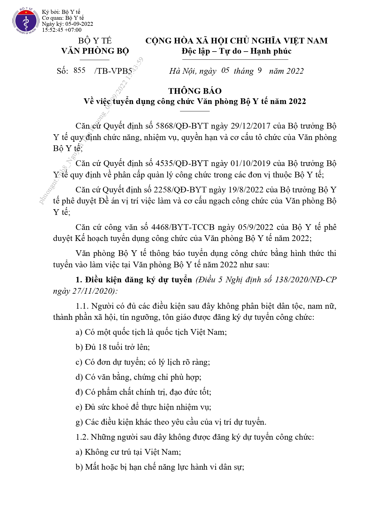 Văn phòng Bộ Y tế thông báo tuyển dụng công chức năm 2022