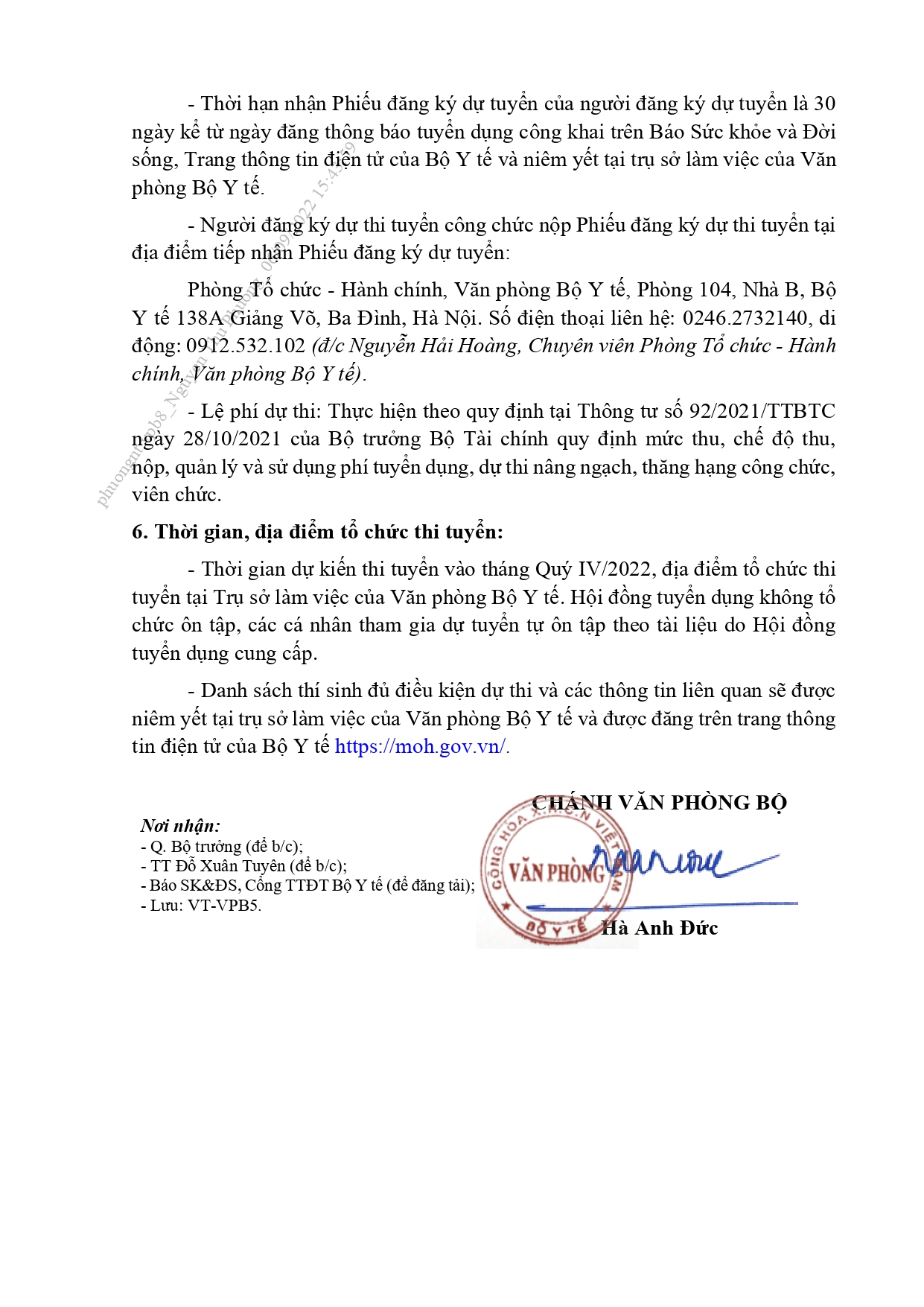 - Thông báo kết quả trúng tuyển và hoàn thiện hồ sơ kỳ thi tuyển công chức năm 2022 của Văn phòng Bộ Y tế