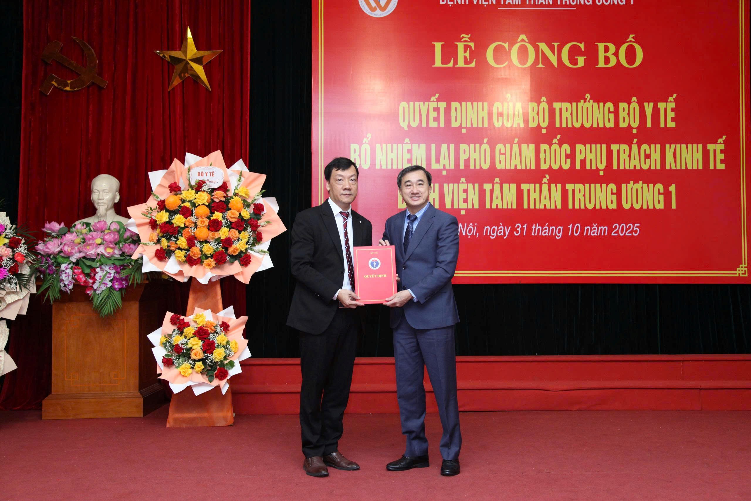 Thứ trưởng Bộ Y tế Trần Văn Thuấn trao Quyết định bổ nhiệm lại chức vụ Phó Giám đốc phụ trách kinh tế Bệnh viện Tâm thần Trung ương 1 đối với TS. Lê Ngọc Tú. Theo Quyết định số 2980/QĐ-BYT ngày 22/9/2025 của Bộ trưởng Bộ Y tế về việc bổ nhiệm lại chức vụ Phó Giám đốc phụ trách kinh tế Bệnh viện Tâm thần Trung ương 1 đối với TS. Lê Ngọc Tú.
