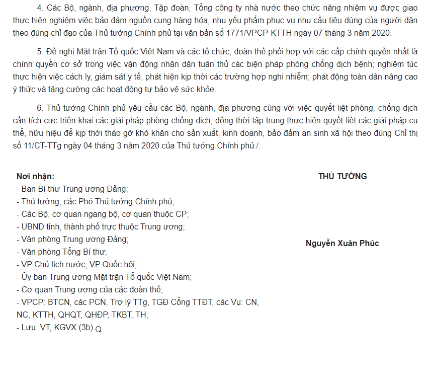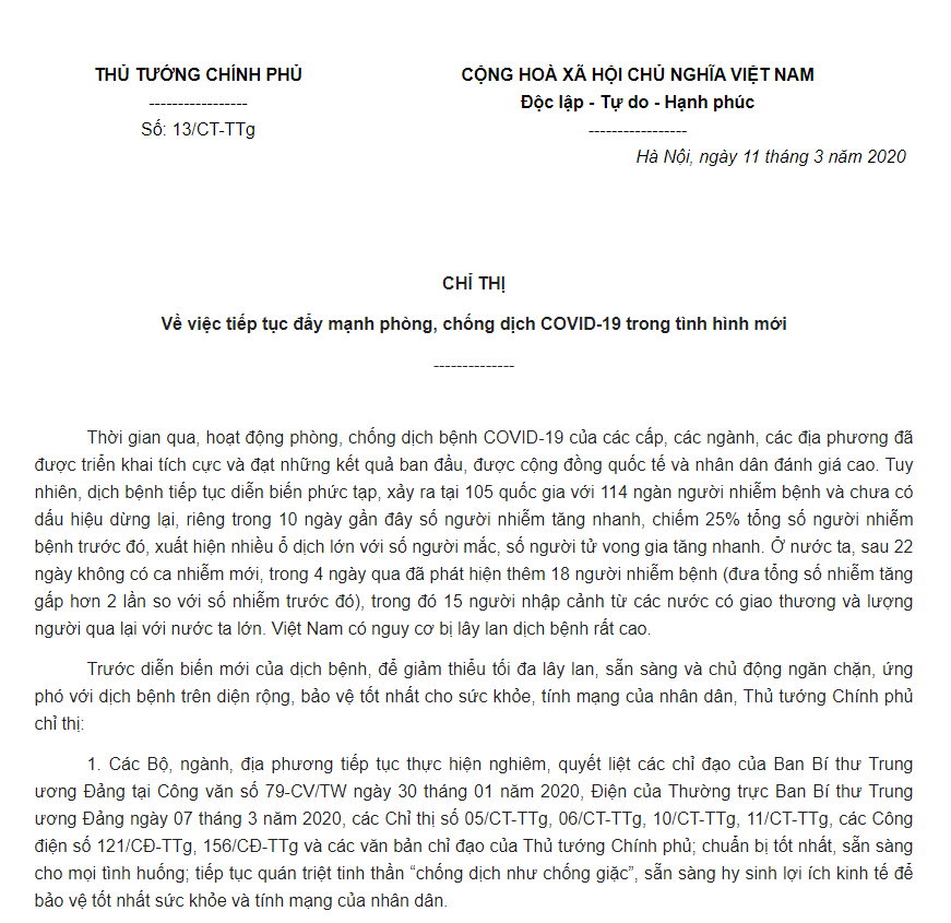 CHỈ THỊ số 13/CT-TTg ngày 11/3/2020 Về việc tiếp tục đẩy mạnh phòng, chống dịch COVID-19 trong tình hình mới